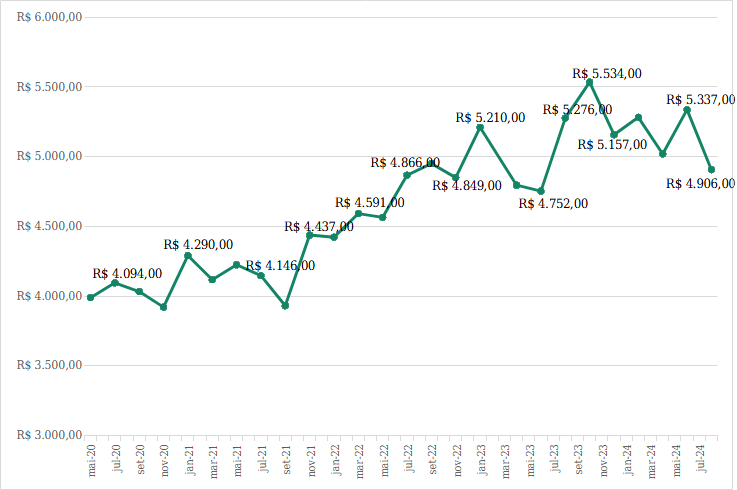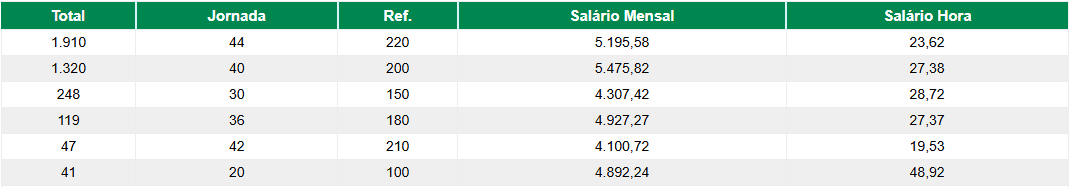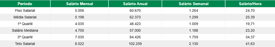 Previsão para 2025: varia entre o piso mínimo de R$5.055,80 e o teto salarial de R$8.521,58.